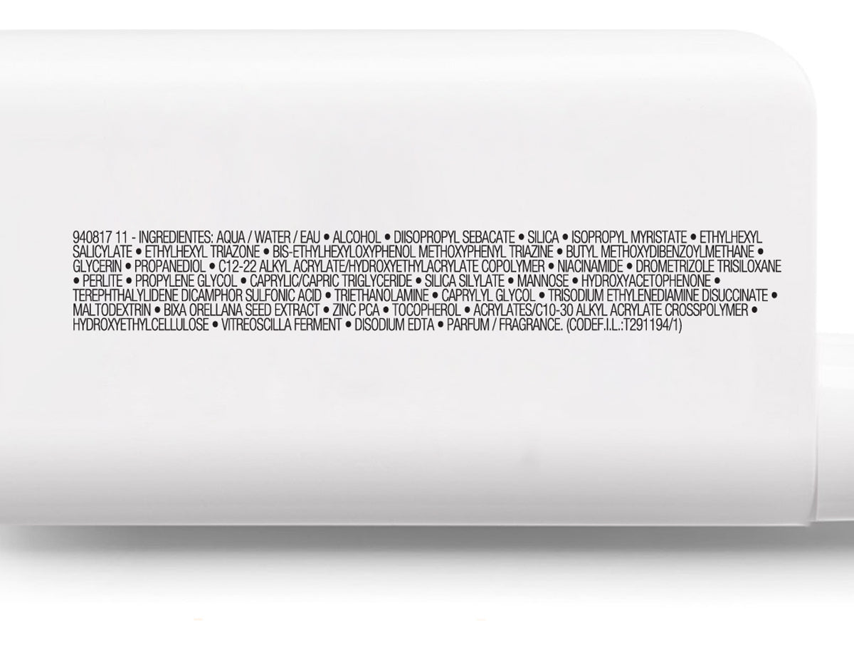 Aqua/Water/Eau, Alcohol, Diisopropyl Sebacate, Silica, Isopropyl Myristate, Ethylhexyl Salicylate, Ethylhexyl Triazone, Bis-Ethylhexyloxyphenol Methoxyphenyl Triazine, Butyl Methoxydibenzoylmethane, Glycerin, Propanediol, C12-22 Alkyl Acrylate/Hydroxyethylacrylate Copolymer, Niacinamide, Drometrizole Trisiloxane, Perlite, Propylene Glycol, Caprylic/Capric Triglyceride, Silica Silylate, Mannose, Hydroxyacetophenone, Terephthalylidene Dicamphor Sulfonic Acid, Triethanolamine, Caprylyl Glycol, Trisodium Ethylenediamine Disuccinate, Maltodextrin, Bixa Orellana Seed Extract, Zinc Pca, Tocopherol, Acrylates/C10-30 Alkyl Acrylate Crosspolymer, Hydroxyethylcellulose, Vitreoscilla Ferment, Disodium Edta, Parfum / Fragrance.
