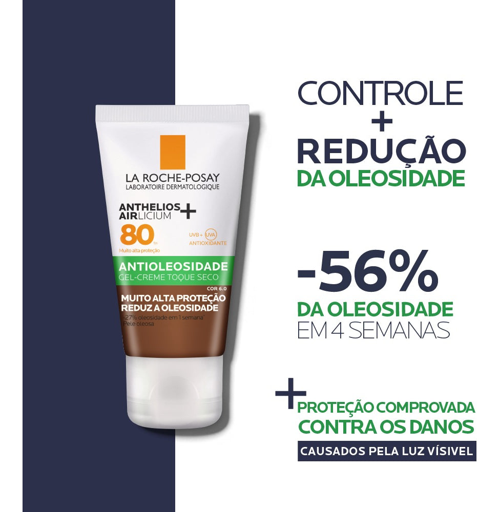 Protetor solar facial com cor. La Roche-Posay Anthelios Airlicium FPS80 protege e oferece um tratamento que reduz a oleosidade em 27% em apenas uma semana e 56% em um mês.