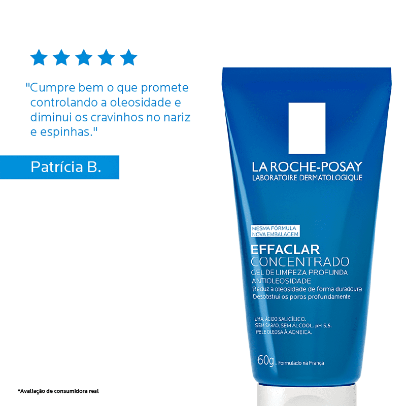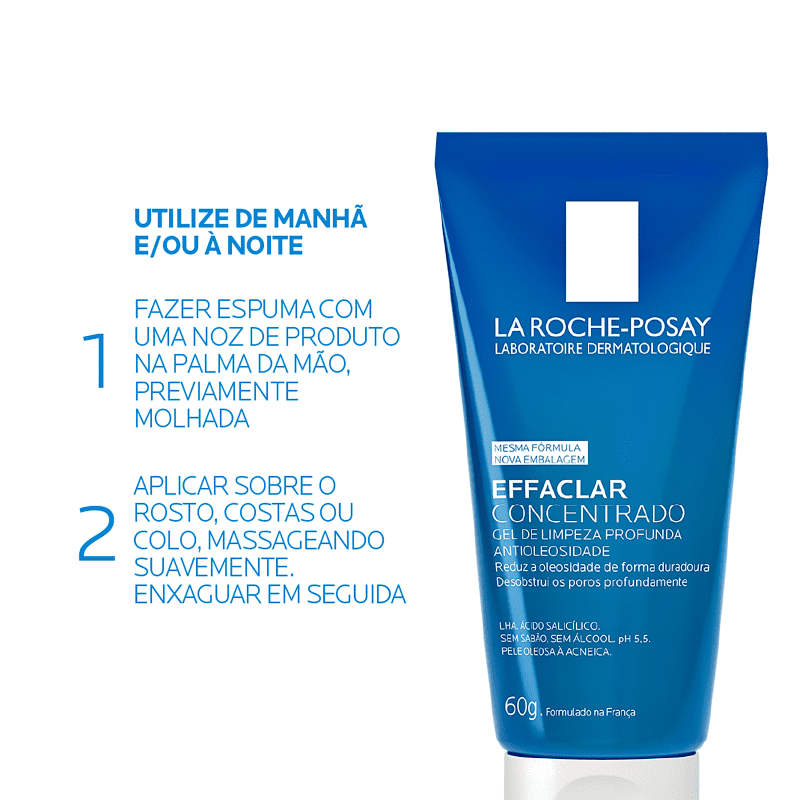 Com fórmula especialmente desenvolvida para suprir as necessidades da pele dos brasileiros, Effaclar Gel Concentrado traz uma combinação única de Ácido Salicílico, Zinco e LHA, ingredientes poderosos que proporcionam eficácia antiacne comprovada