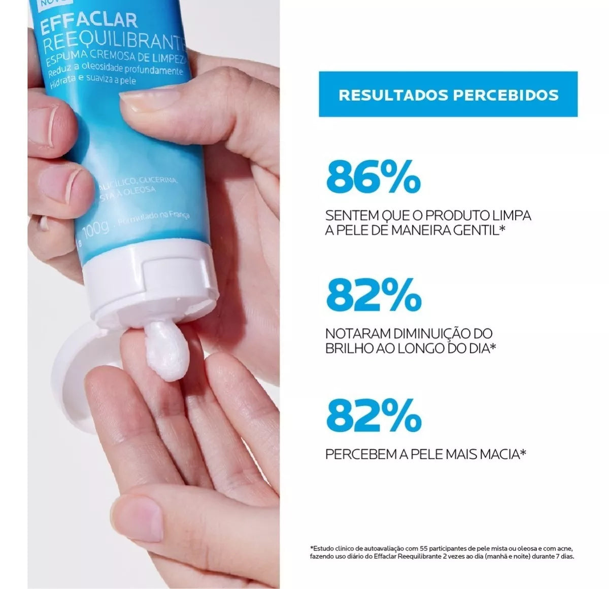 A Espuma Cremosa de Limpeza Facial La Roche-Posay Effaclar Reequilibrante conta com uma textura inovadora que higieniza na medida certa, retirando resíduos e controlando o brilho ao longo do dia. Seus resultados já são notados no primeiro uso!
