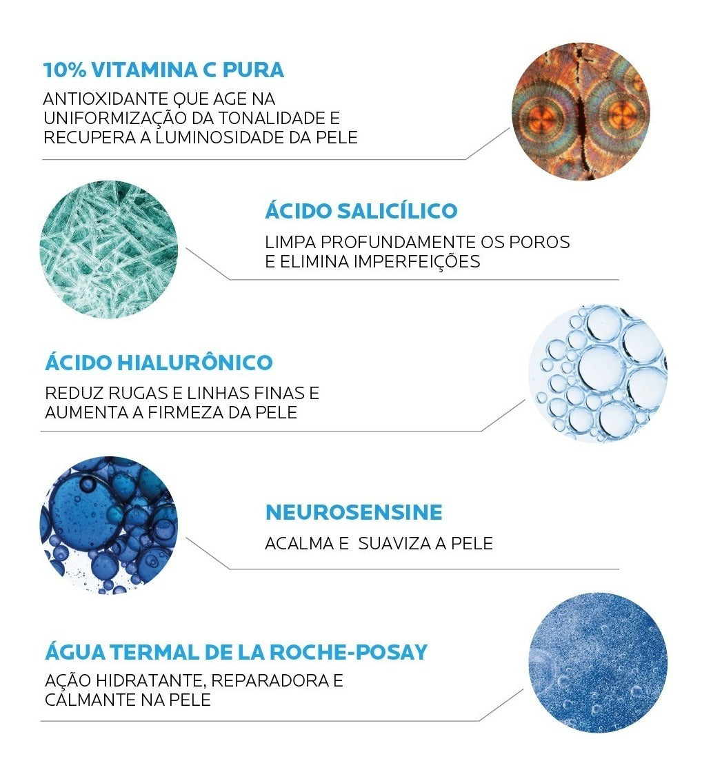 O Sérum Facial La Roche-Posay Pure Vitamin C10 possui textura leve, não oleosa e de rápida absorção que reduz linhas finas, suaviza poros dilatados, melhora o viço, a firmeza e acalma a pele do rosto. Ele conta com uma combinação única de ingredientes que garantem máxima eficácia e alta tolerância às peles sensíveis.